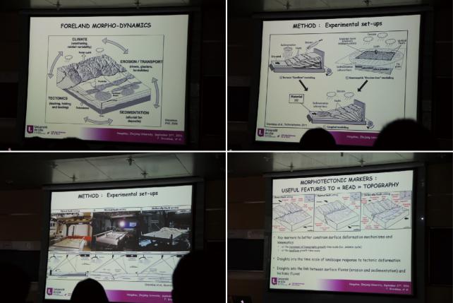 在报告中,Fabien GRAVELEAU博士首先介绍了在不同构造背景下(挤压、伸展和走滑)地貌演化的典型特征,在综合考虑构造、剥蚀、沉积的情况下,如何选取材料、安装设备、设置参数,进而模拟出构造变形特征及相关地貌的动力学演化过程。