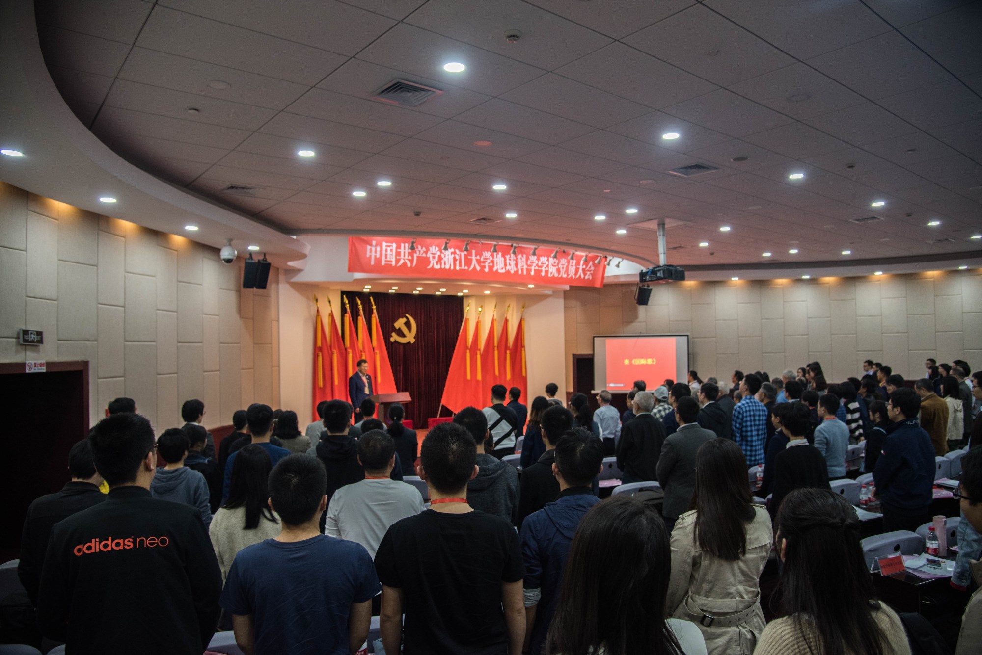 2017年10月27日下午,中国共产党永利集团304am官方入口党员大会在玉泉校区邵逸夫科技馆117会议室隆重召开。此次大会适逢党的十九大胜利闭幕,是在我国全面建成小康社会、夺取新时代中国特色社会主义伟大胜利、实现中华民族伟大复兴的时代背景下,在学校建设中国特色世界一流大学的历史节点上,在学院实施“十三五”规划、聚焦“双一流”建设重要机遇期召开的一次十分重要的会议。永利集团304am官方入口党委常委、党委副书记兼纪委书记叶民出席大会并讲话,学院215名党员出席大会,其中正式党员193名,预备党员22名,常务副院长夏群科教授和副院长曹龙教授作为特邀来宾列席了会议。会议由学院党委副书记兼纪委书记陈宁华主持。大会在庄严的《国歌》声中拉开帷幕。